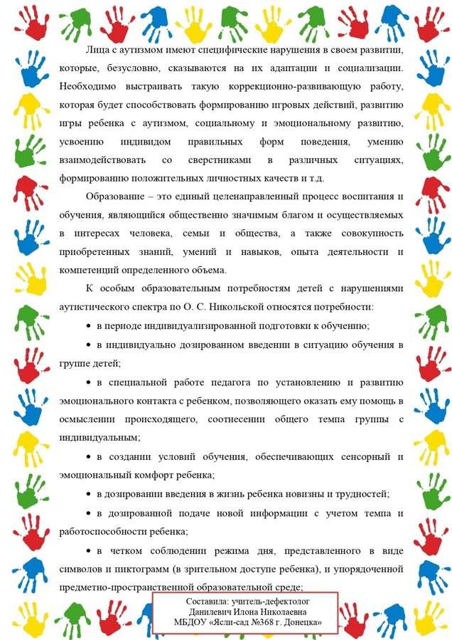 Ко Всемирному дню распространения информации об аутизме, педагог-психолог МБДОУ"Ясли-сад №368 г.Донецка" Страховская Ася Леонидовна, рассказала жителям города Донецка об особенностях людей с аутизмом. Осветила информацию о знаменитых людях с данным диагнозом,о том что им нужна поддержка и общение. Предложила поучаствовать в акции #Зажгисиним.